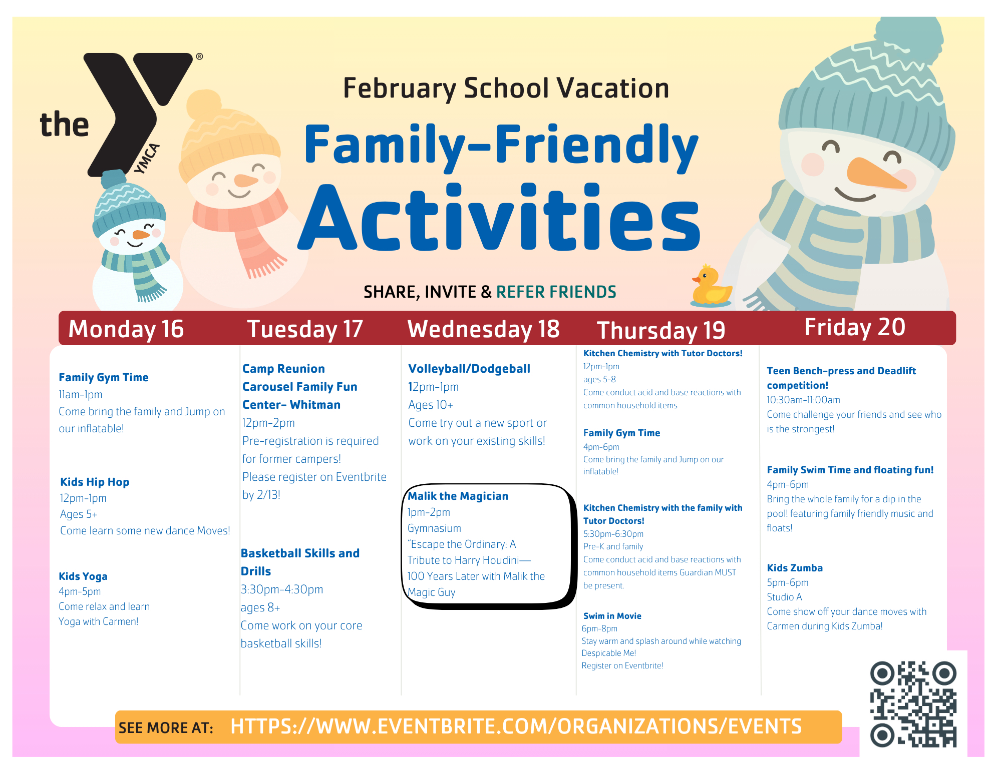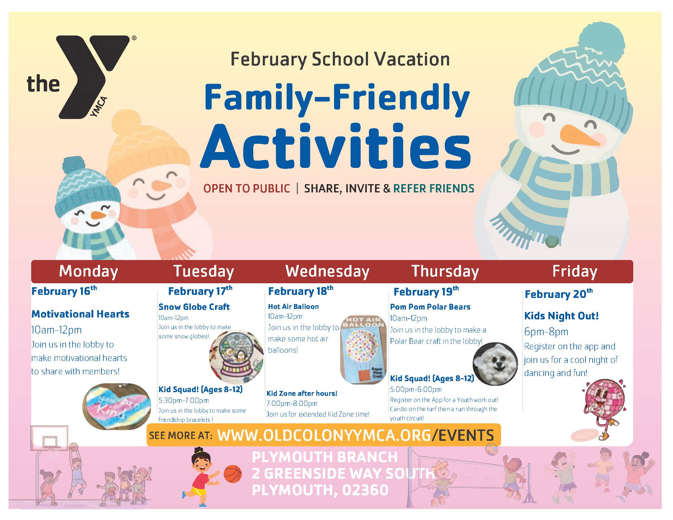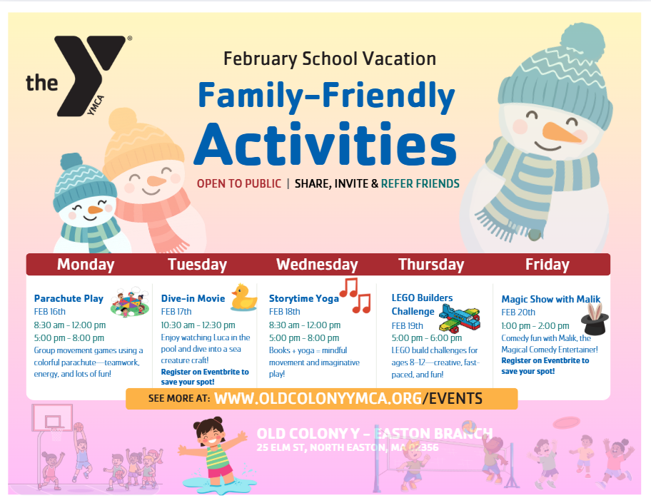 The YMCA offers a wide variety of events for kids, adults, families, seniors and more. February School Vacation ActivitiesView YMCA Branch location events & activity calendars below: Brockton (Coming soon) | Easton | EB| Middleboro | Plymouth | Stoughton | TauntonCalendar SnapshotPreview family-friendly activities and community events happening at our branch locations.Please note that the events listed in the Spotlight Calendar above are exclusively sourced from Eventbrite. However, many other family-friendly events and activities can be found at our branch locations. We encourage you to explore additional event flyers for school vacation weeks posted throughout the year, or to reach out to our friendly staff at the Welcome Centers for further information.Find Local Events Brockton See Events East Bridgewater See Events Easton See Events Middleboro See Events Stoughton See Events Plymouth See Events Taunton See Events